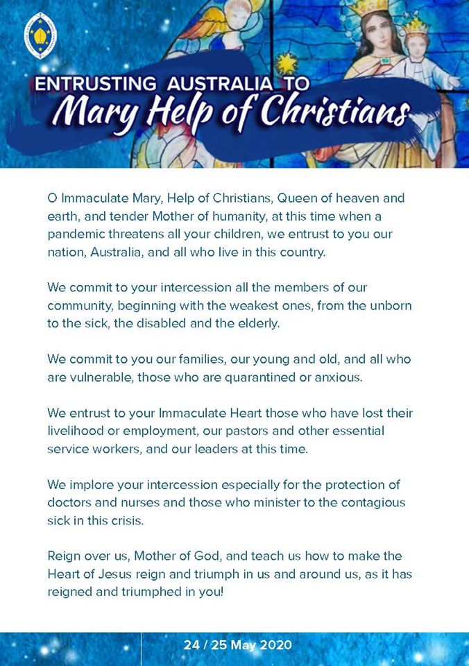 In this time of pandemnic, the Bishops of Australia have entrusted Australia to the care and intercession of Mary, Help of Christians, Patroness of Australia