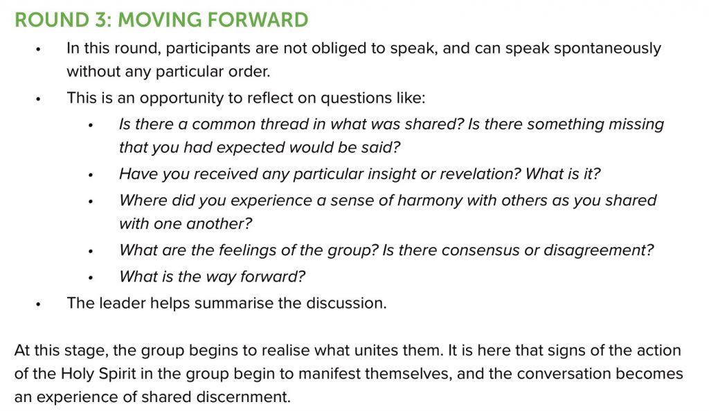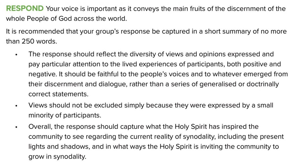 Read and reflect on the following questions in silence. Choose one or more questions that speak to you the most. Please ensure that you record your group response for each question. Now reflect on your personal experience of faith, life and the Church related to these questions. Write a list of all the responses to these questions that come to mind. Share aloud all of the responses you have written down, working together through Step 3