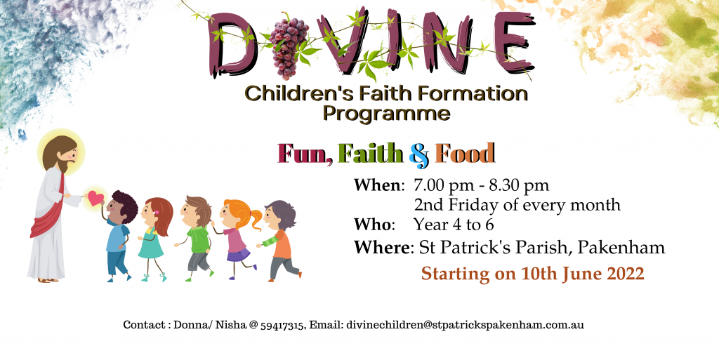This is the next youth event of our western region parishes – Berwick, Narre Warren, Cranbourne, Clyde North, Pakenham, Koo Wee Rup, Iona/ Maryknoll – and all the youth and young adults of our parishes are invited to a day filled with music, workshops, group discussions, BBQ, worship and praise. This will be at St Agatha’s parish, Sladen Street, Cranbourne on Saturday 17th February, from 9:30 to 4:00pm. Registrations begin at 8:30am. Registrations forms are in our foyer or contact Siji @ 59417315 for further information.